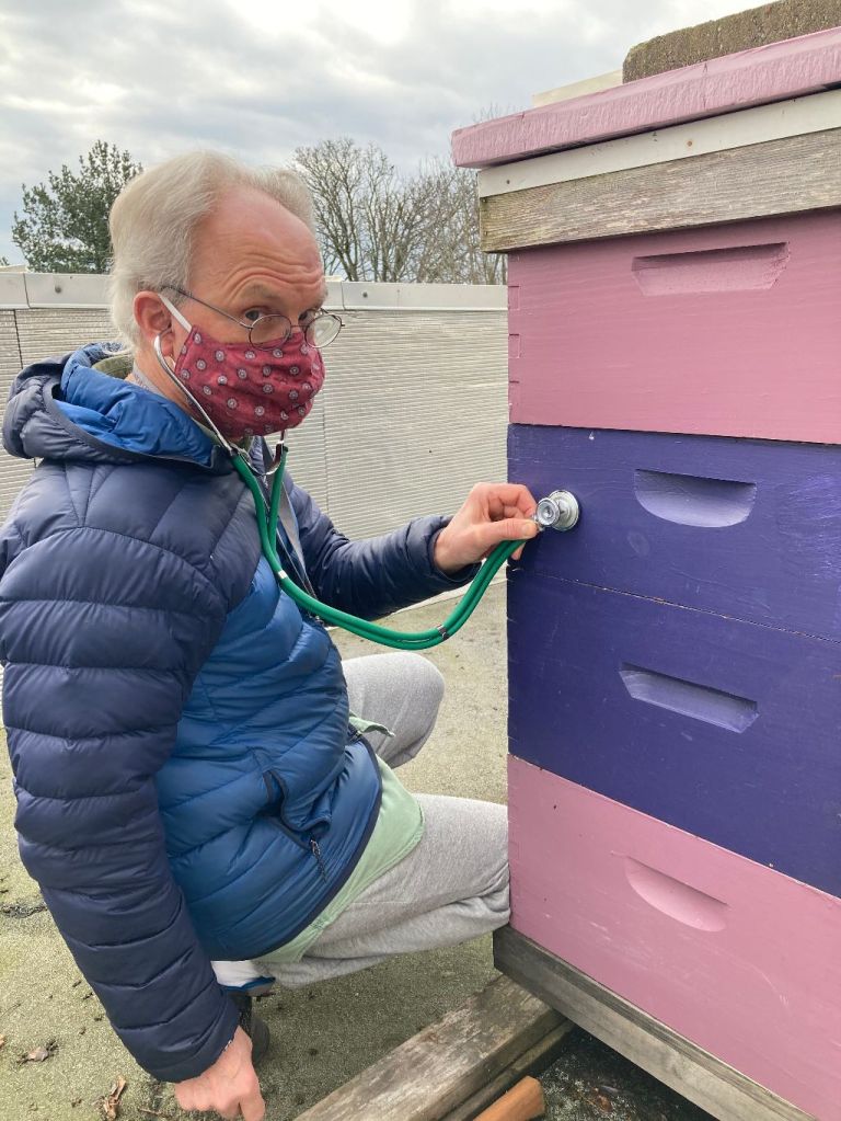 Rob has gone to see his honeys, thousands of them. The honeybees, hunkered together on the cathedral’s roof, might give him a sign. Otherwise we are not certain the hive thrives. He’s learned after years of losing colonies during the winter not to open the hive. It’s tempting to break the interior beeswax seals to peek in. Instead Rob bought a stethoscope so we might listen in from the outside. But wait, is that the hum of bees? Or the freeway below? Regardless, have faith! The bee doctor is in. Together we will hope and wait.