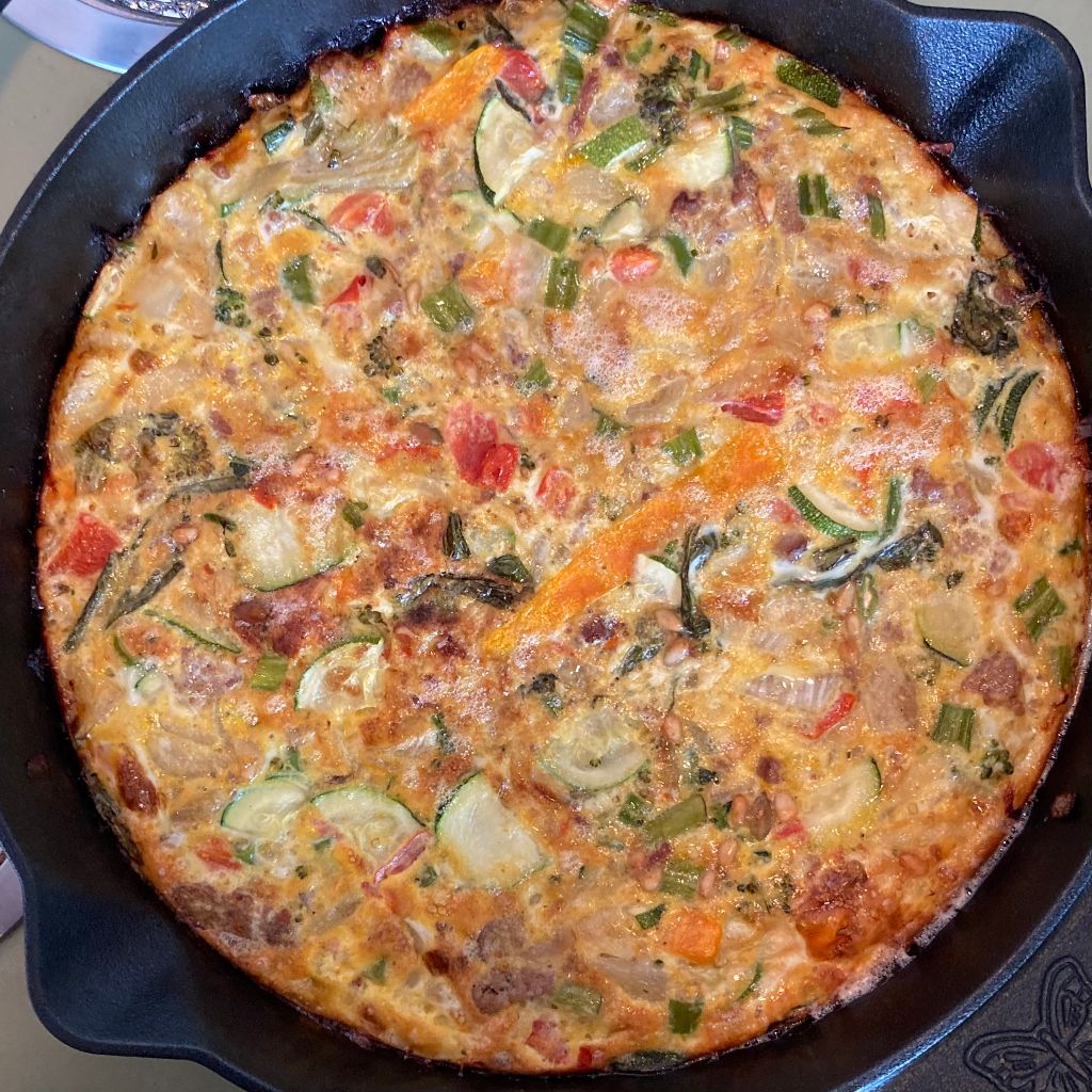 In the past, we called it Lumami Frittata, employing the Chilean word for leftovers. This summer though, it became Wednesday Fritatta because midweek, we toss in whatever’s left in the fridge to be consumed before we replenish our local organic vegetables on CSA Thursday. This week’s one-pan meal included onions, the-most-giant-garlic-clove-ever, zucchini, broccolini, carrots, salad and chopped lamb burger remaining from lunch, plus a few nuts for crunch….all salted and seared in olive oil, covered with eight beat eggs then baked at 375 degrees for 20 minutes. This dish is different and delicious every time.