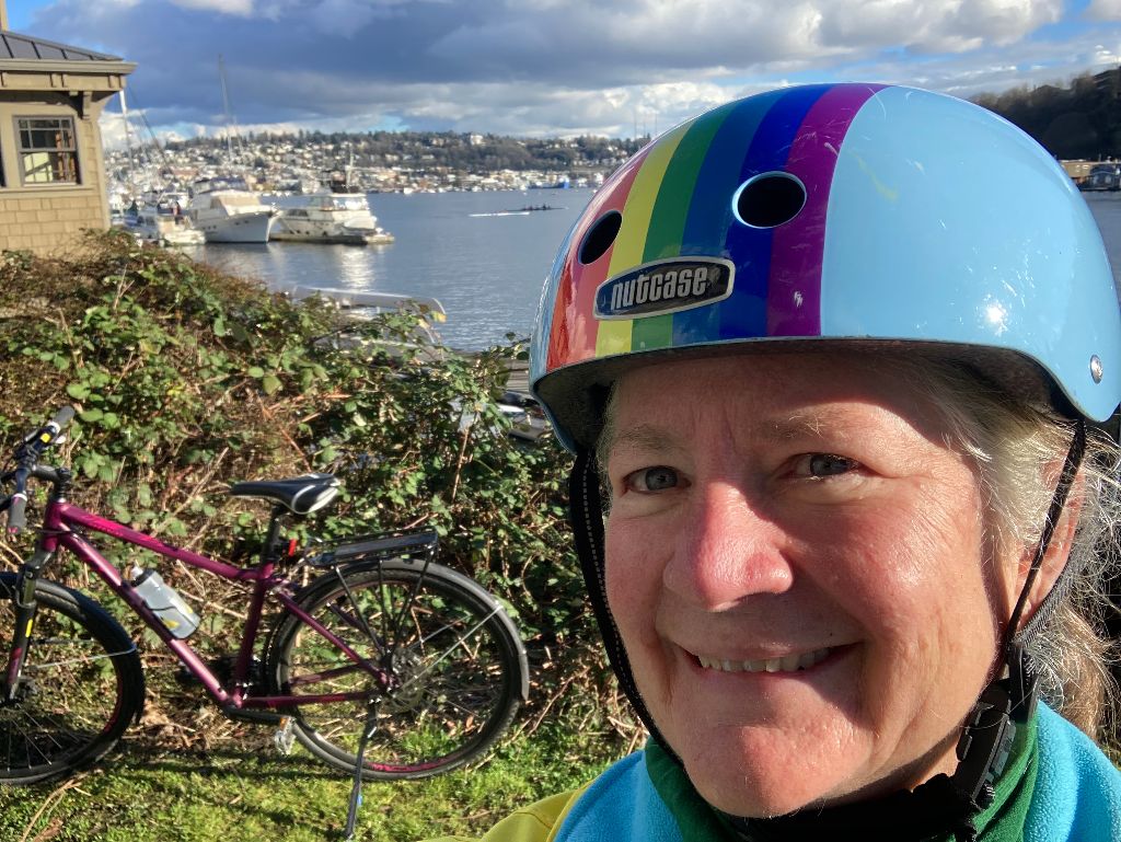 In early spring here in Seattle, we all go outside when it’s not raining and the sun is peeking through. Reflecting worldwide reality, there likely will be clouds in the sky but joy is prominent. Her Purpleness and I were biking yesterday, celebrating the returning light.