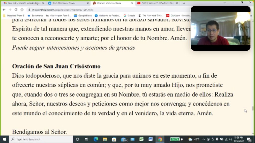 On Tuesdays at 10, my friend Libe and I read prayers together in Spanish over Zoom: Oración de la Matutina de Martes (OMM). All are welcome, for we know when two or three are gathered in Christ’s name, God is with us.