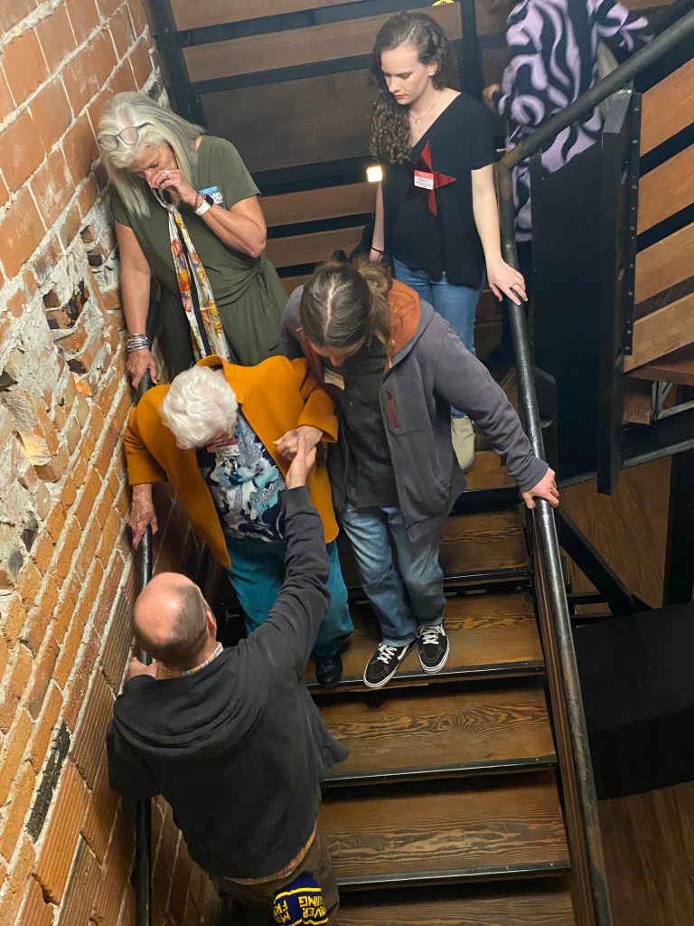 So much love and care helping Mom down the stairs. A nurse, EMT, daughter and nephewall lended a hand.