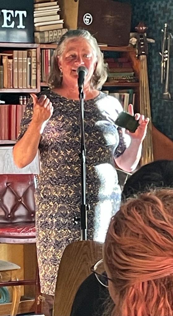 MC Isaac played a tune and then speculated that the crowd was a bit shy. When he said spoken word would do, I stepped up, read “Those Trolls” (two posts back), even got a laugh or two. My tablemates snapped this photo.