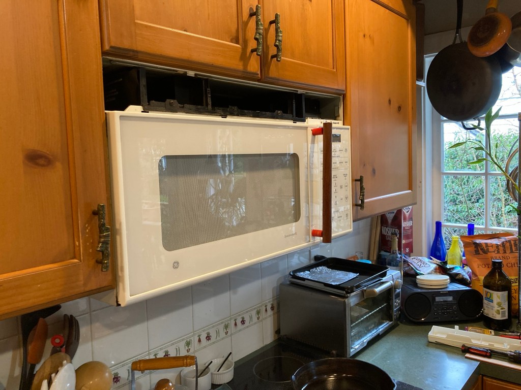 For those of you clamoring to know my Mister Fix-it’s latest shenanigans: Note long-standing jerry-rigged handle on microwave, the machine that has blown three fuses recently. I was surprised yesterday (and delighted) to hear him whisper, “We might have to get a new one.”