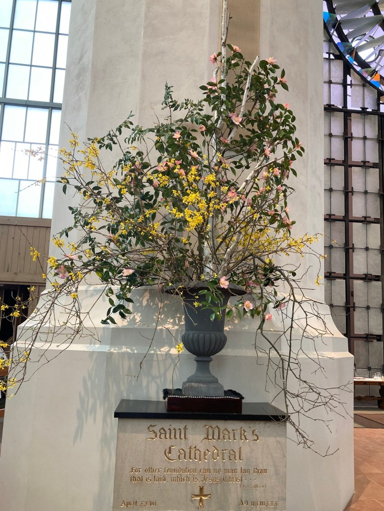 Ray used “Forsythia!” and “Camellia!” His asymmetrical masterpieces have earned him the nickname Ray-Angelo from one of his flower teammates. He says when creating an arrangement that his goal is to bring the outside in. This act describes my seeking after glory and splendor well.