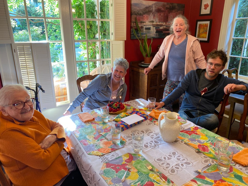After all, my immediate chores for celebrating my sister Susan’s birthday were complete. She and her wife CrisMarie had a layover in Seattle and were stopping by for the evening. Our son Clarke had already arrived for a week’s visit. The chance to see Grandma and be together for a little party was brewing. Wonder what lacerations on a 96-year-old would add to the anticipation?